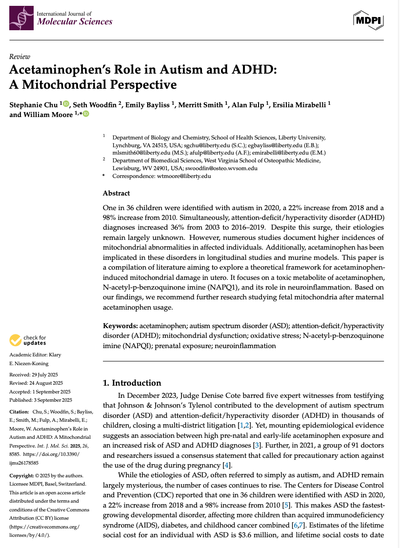 Authors reviewed a large number of studies investigating acetaminophen's role for increasing autism and ADHD. While one Swedish study did not find an increase in autism, the majority of studies provided evidence suggesting that acetaminophen could negatively alter normal brain development in the unborn child during pregnancy. The Swedish study, which found no link, was criticized for not considering the dose taken by the mother, and for some reason did not include a mother's over-the-counter use of Tylenol. Concern was also expressed regarding the metabolite NAPQ1, which forms as acetaminophen is metabolized by the body. The metabolite is known to be highly toxic, and if the mother has low levels of glutathione (which removes free radicals generated by environmental toxins), the damage to the developing baby increases significantly. Other studies were reviewed, finding that acetaminophen inhibits endocannabinoid hormones, which are involved in brain development. This is a newly published study (Sep 2025) and provides an easy-to-read summary of current and past acetaminophen research.
