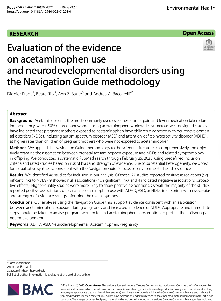 We applied the Navigation Guide methodology to the scientific literature to comprehensively and objectively examine the association between prenatal acetaminophen exposure and NDDs and related symptomology in offspring. We conducted a systematic PubMed search through February 25, 2025, using predefined inclusion criteria and rated studies based on risk of bias and strength of evidence. Due to substantial heterogeneity, we opted for a qualitative synthesis, consistent with the Navigation Guide’s focus on environmental health evidence.